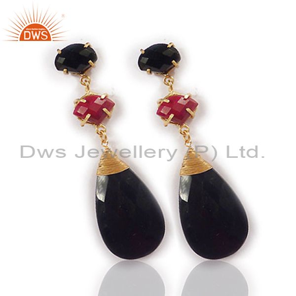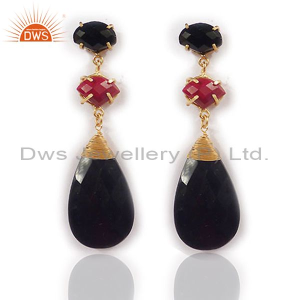18K Yellow Gold Plated Red Aventurine And Black Onyx Womens Dangle Earrings