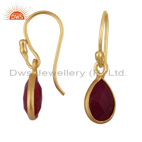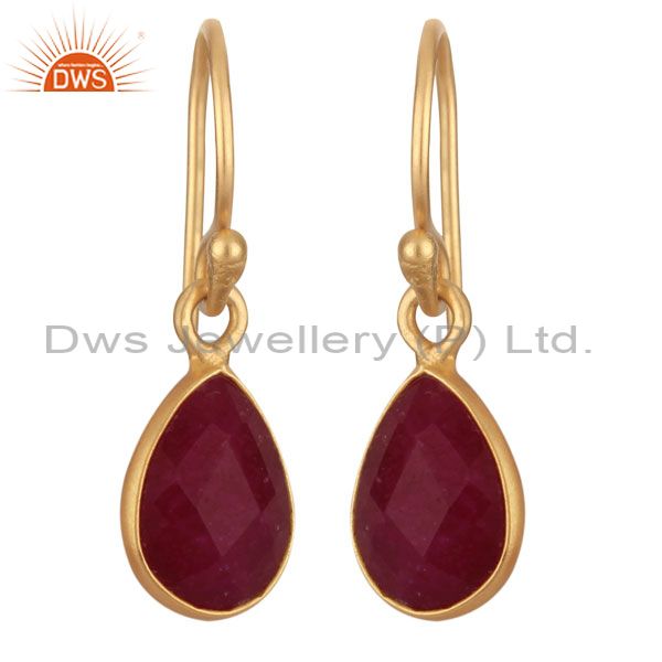 18K Yellow Gold Plated Silver Dyed Ruby Gemstone Bezel Set Teardrop Earrings