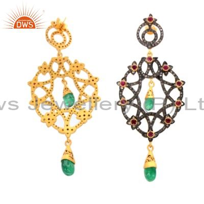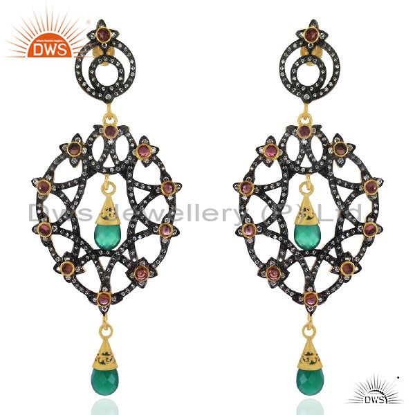 18K Yellow Gold Plated Silver Green Onyx & Pink Glass Vintage Look Earrings