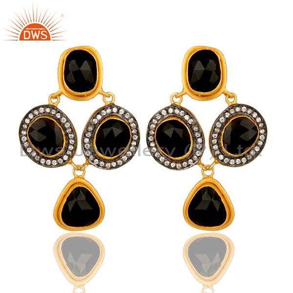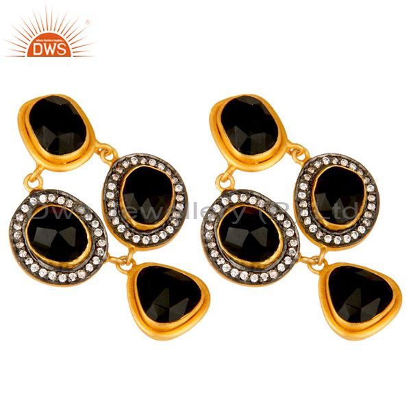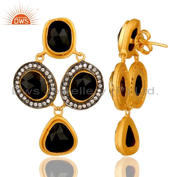 18K Yellow Gold Plated Sterling Silver Black Onyx And Cz Fashion Earrings