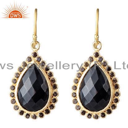 18K Yellow Gold Plated Sterling Silver Black Onyx And Smoky Quartz Drop Earrings