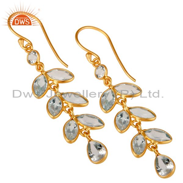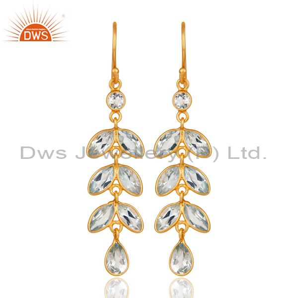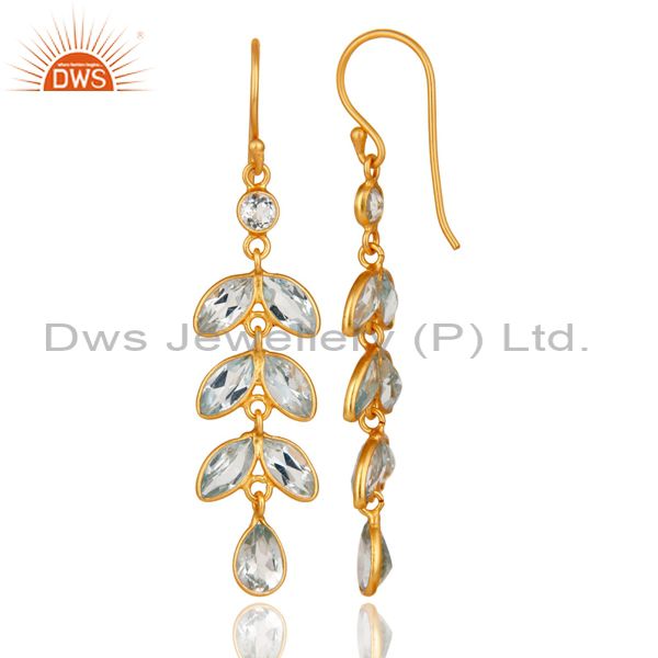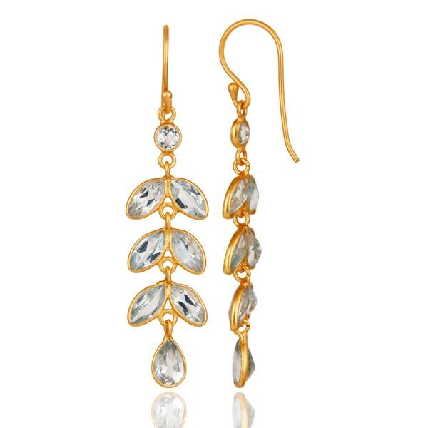 18K Yellow Gold Plated Sterling Silver Blue Topaz Designer Leaf Dangle Earrings