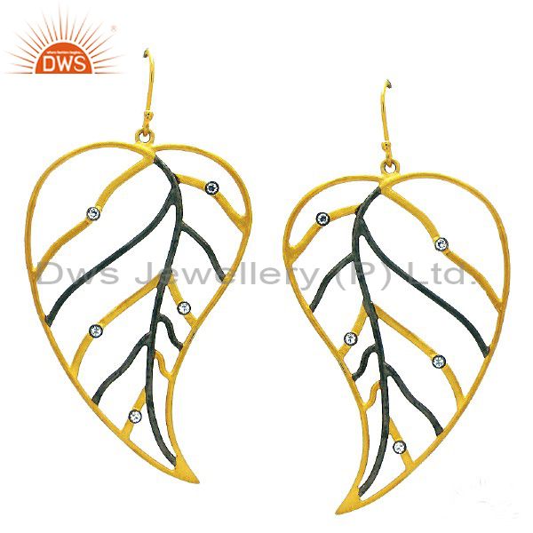 18K Yellow Gold Plated Sterling Silver Cubic Zirconia Leaf Design Dangle Earring