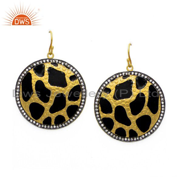 18K Yellow Gold Plated Sterling Silver Cz And Black Enamel Dangle Earrings
