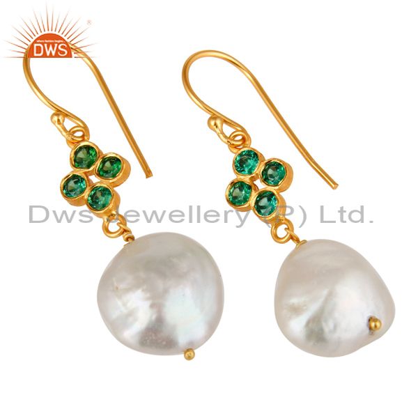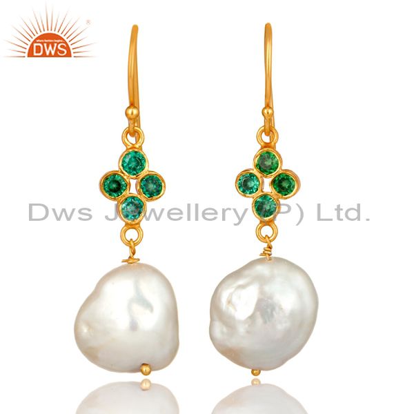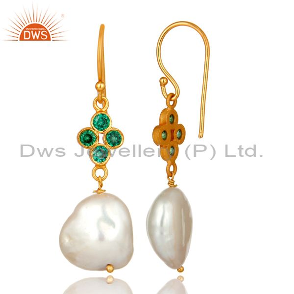 18K Yellow Gold Plated Sterling Silver Green Cz And Natural Pearl Dangle Earring