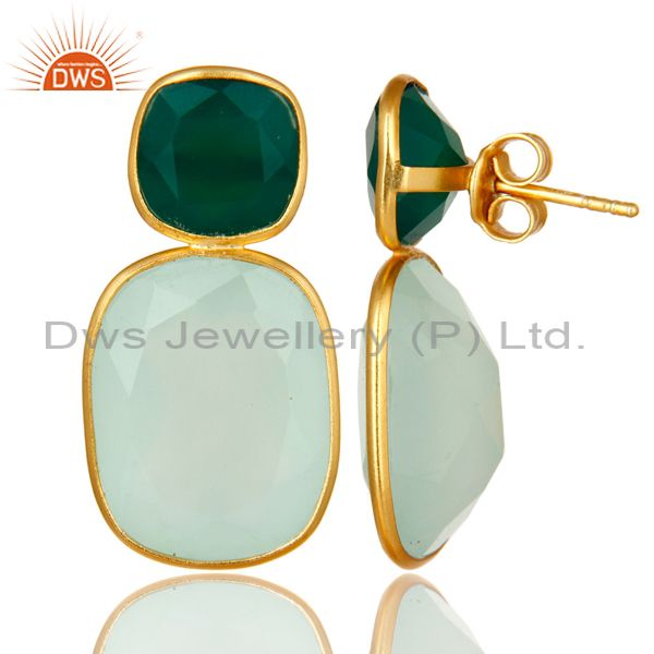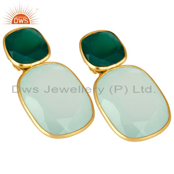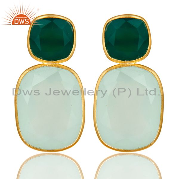 18K Yellow Gold Plated Sterling Silver Green Onyx And Chalcedony Dangle Earrings