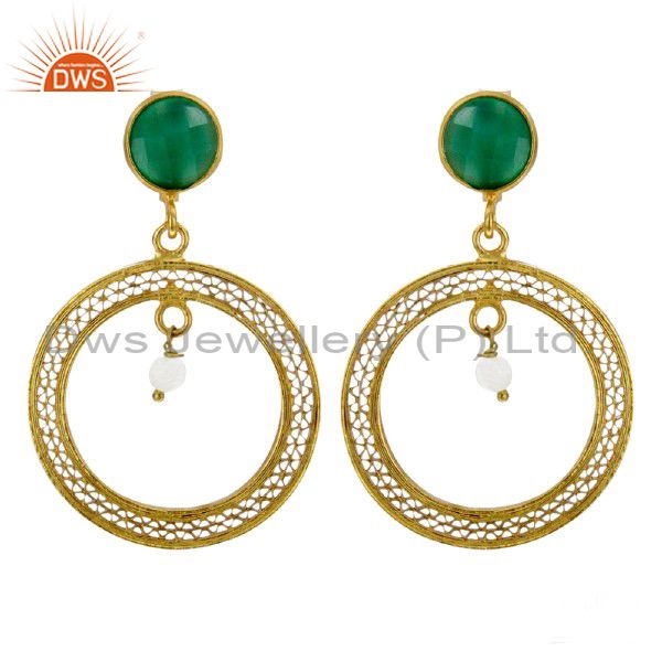 18K Yellow Gold Plated Sterling Silver Green Onyx And Pearl Dangle Earrings