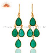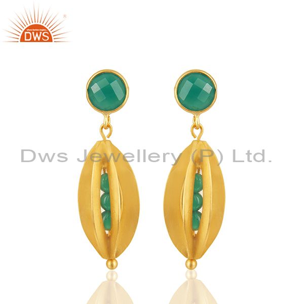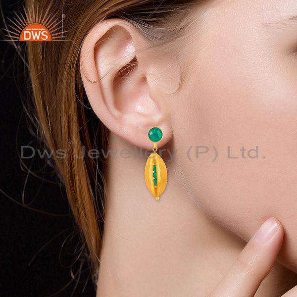 18K Yellow Gold Plated Sterling Silver Green Onyx Matte Finish Dangle Earrings