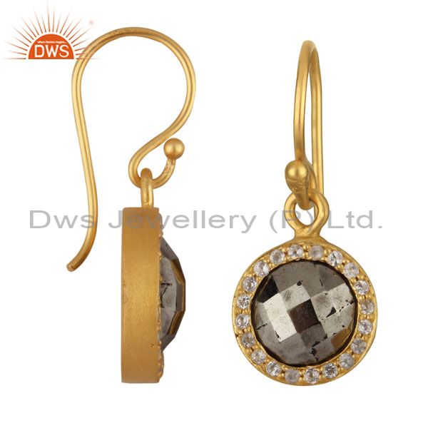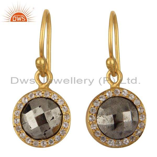 18K Yellow Gold Plated Sterling Silver Pyrite And White Topaz Halo Drop Earrings