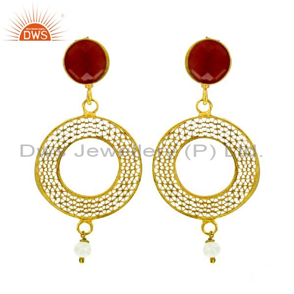 18K Yellow Gold Plated Sterling Silver Red Onyx & Pearl Filigree Dangle Earrings