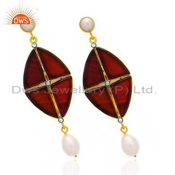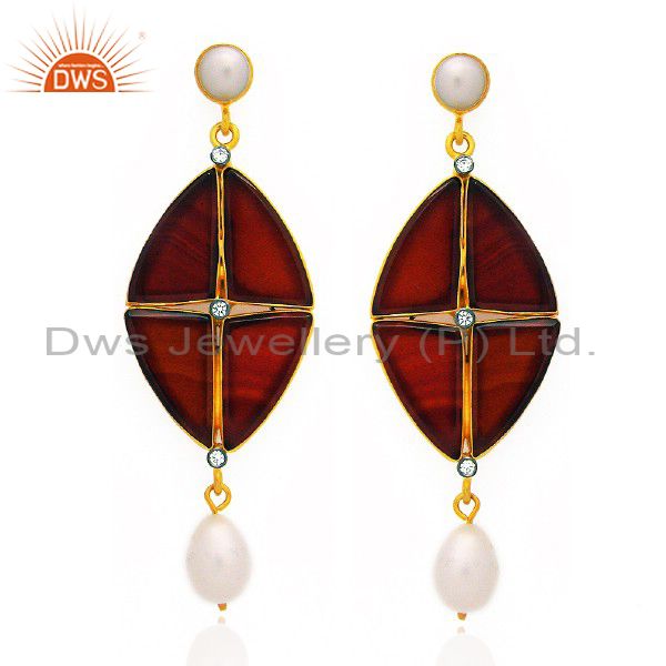 18K Yellow Gold Plated Sterling Silver Red Onyx And Pearl Dangle Earrings