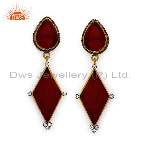 18K Yellow Gold Plated Sterling Silver Red Onyx Dangle Earrings With Cz