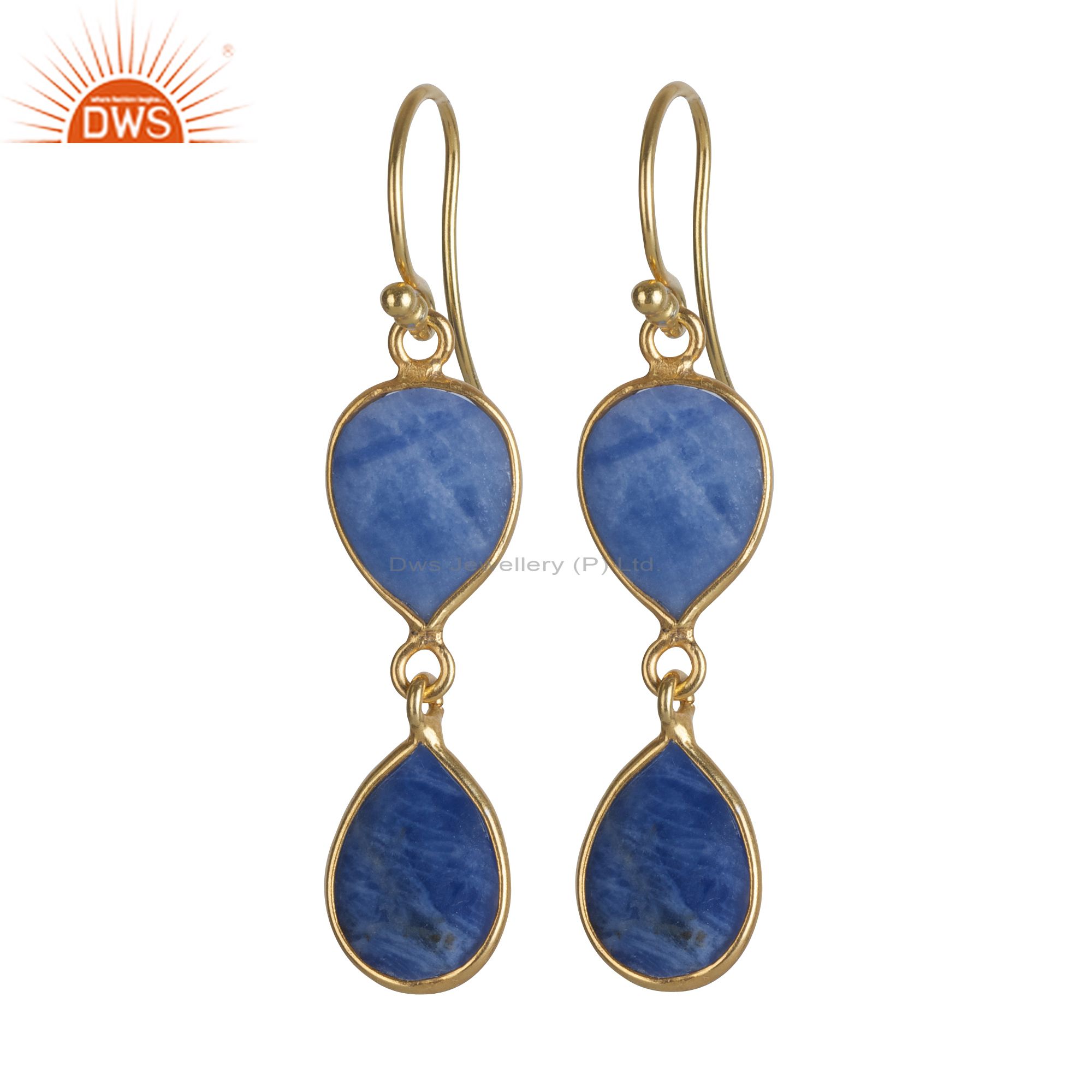 18K Yellow Gold Plated Sterling Silver Sodalite Bezel Set Double Drop Earrings
