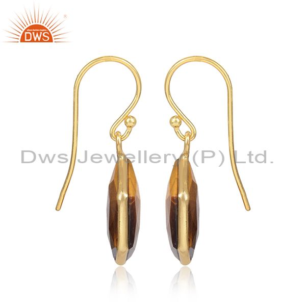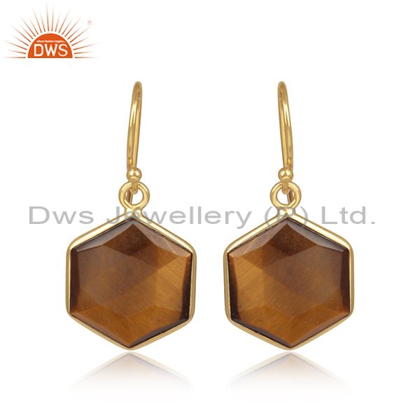 18K Yellow Gold Plated Sterling Silver Tiger Eye Bezel Hexagon Dangle Earrings