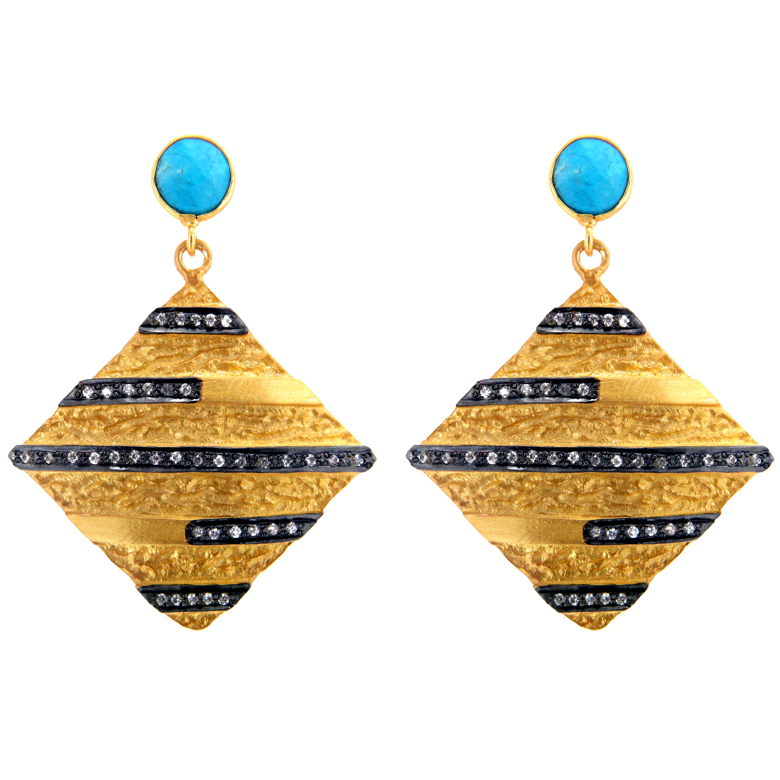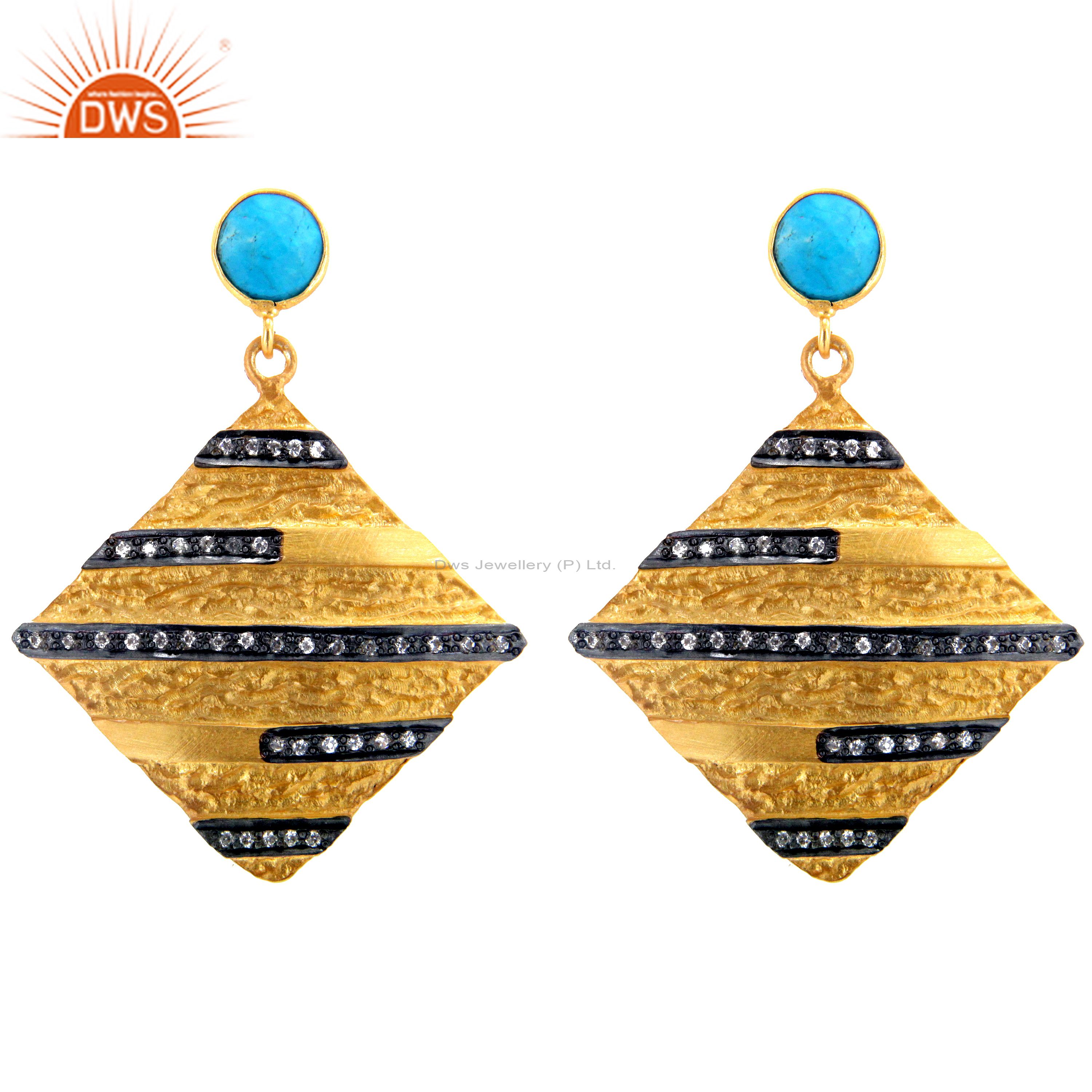 18K Yellow Gold Plated Sterling Silver Turquoise And Cz Designer Dangle Earrings