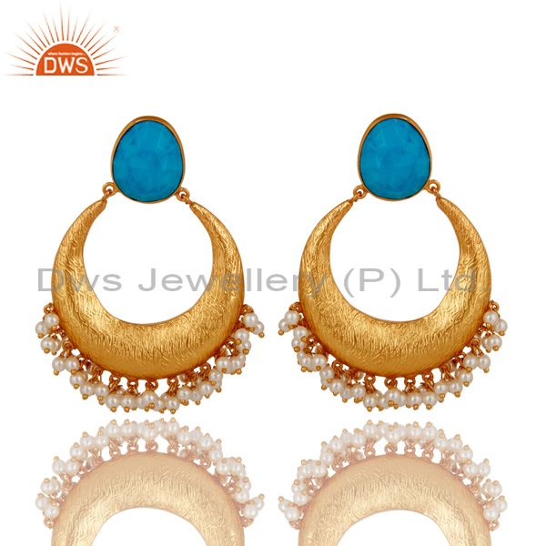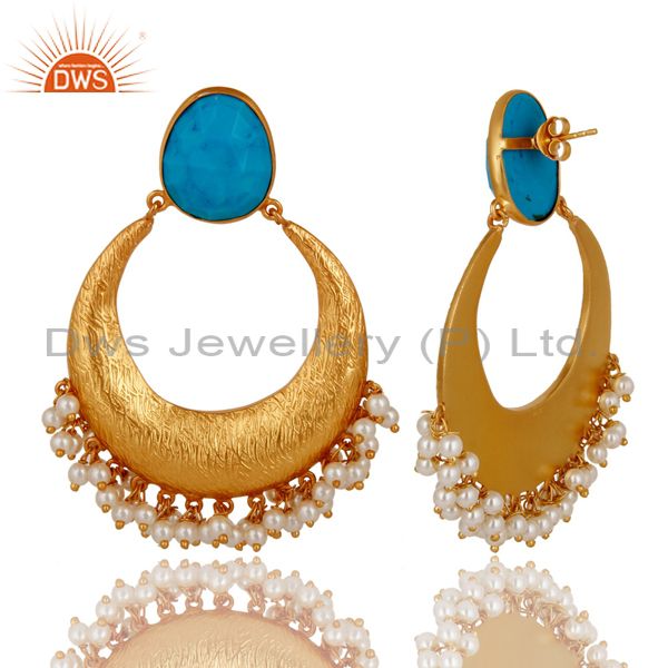 18K Yellow Gold Plated Sterling Silver Turquoise And Pearl Ethnic Dangle Earring