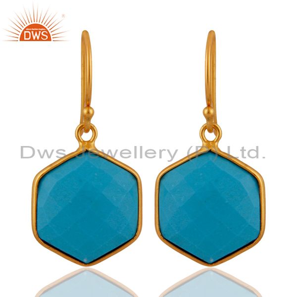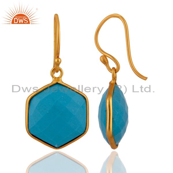 18K Yellow Gold Plated Sterling Silver Turquoise Bezel Set Hexagon Drop Earrings