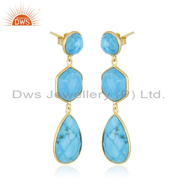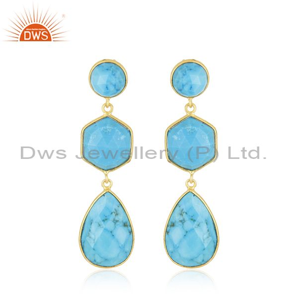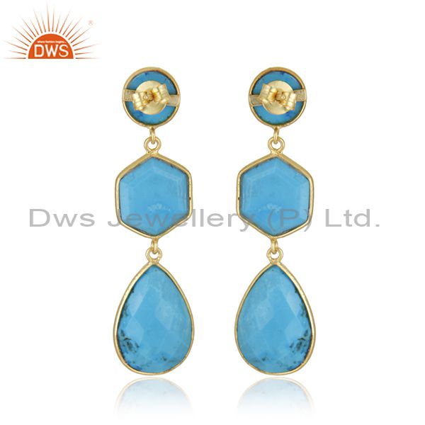 18K Yellow Gold Plated Sterling Silver Turquoise Bezel Set Triple Dangle Earring