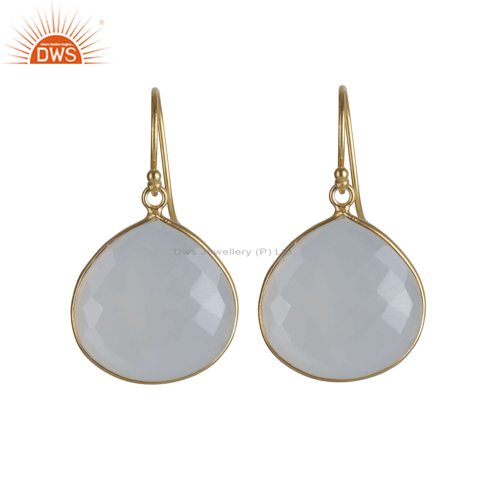 18K Yellow Gold Plated Sterling Silver White Chalcedony Bezel Set Dangle Earring