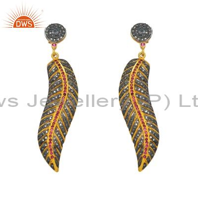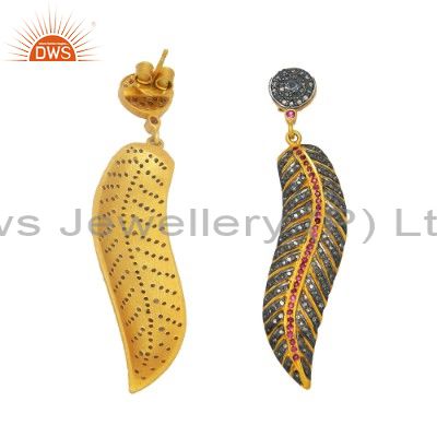 18K Yellow Gold Sterling Silver Ruby And Pave Set Diamond Leaf Dangle Earrings