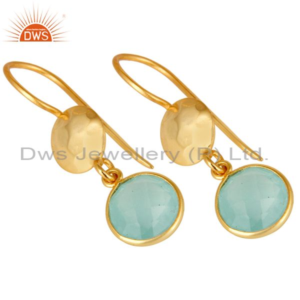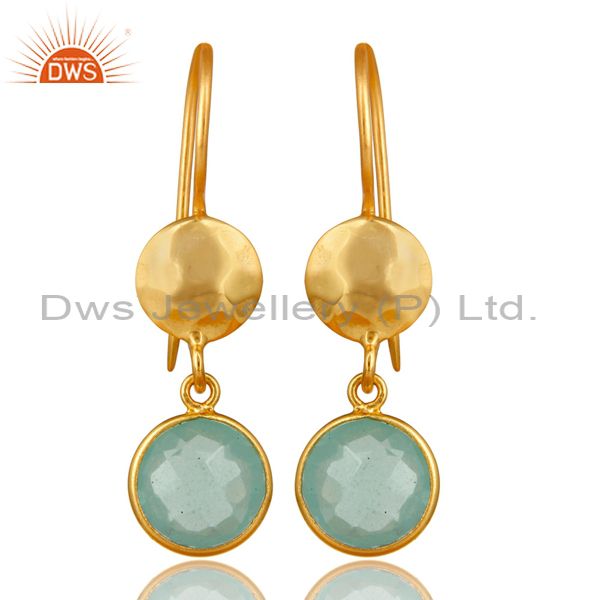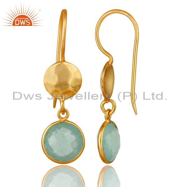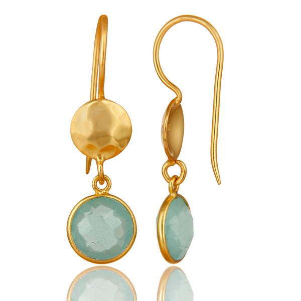 22K Gold Plated Silver Aqua Glass Chalcedony Hammered Disc Dangle Earrings