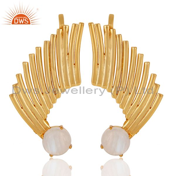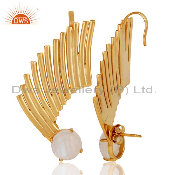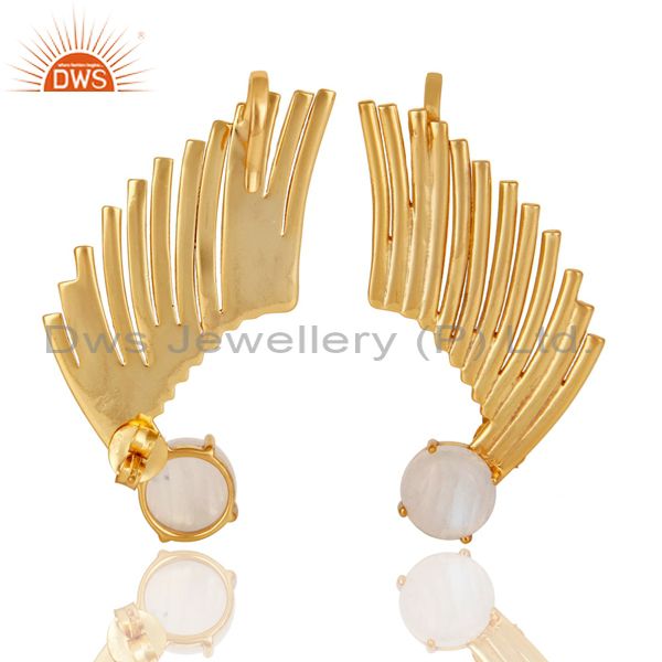 22K Gold Plated Sterling Silver Art Deco Rainbow Moonstone Ear Cuff Stud Earring