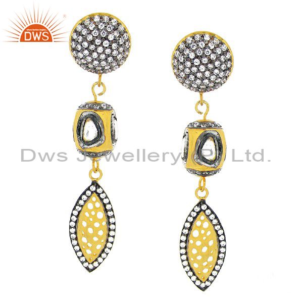22K Gold Plated Sterling Silver Cz Crystal Polki Antique Style Dangle Earrings
