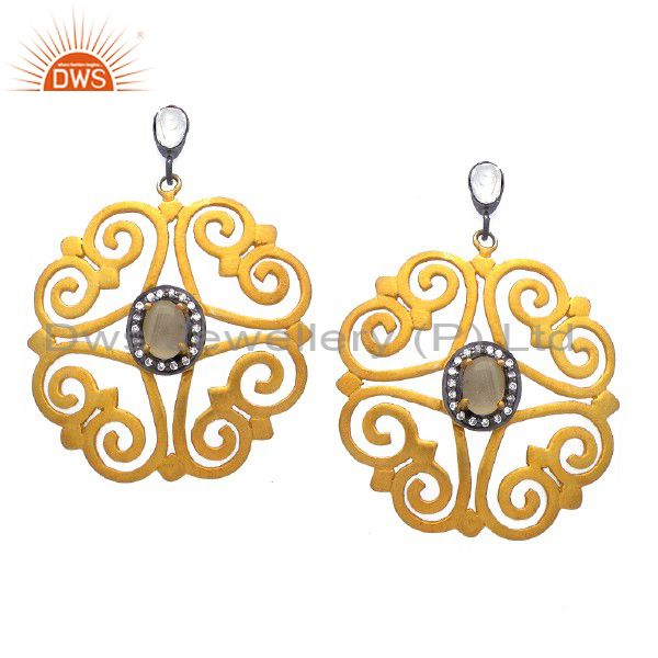 22K Gold Plated Sterling Silver Green Tourmaline & Cz Designer Dangle Earrings
