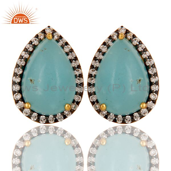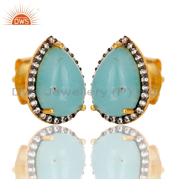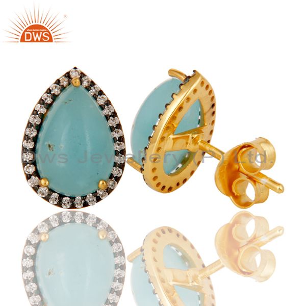 22K Gold Plated Sterling Silver Larimar & White Zircon Prong Set Studs Earrings