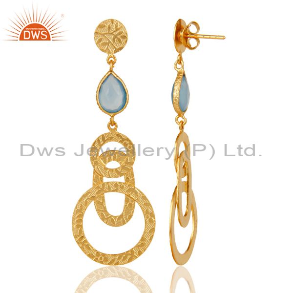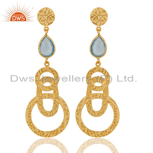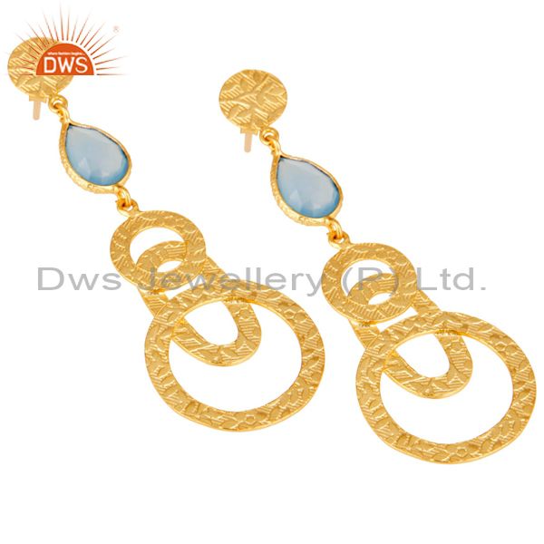 22K Gold Plated Sterling Silver Textured Bezel Set Dyed Chalcedony Drop Earrings
