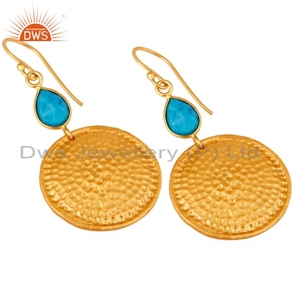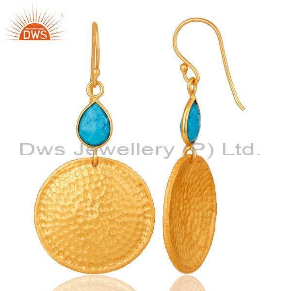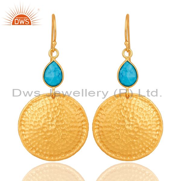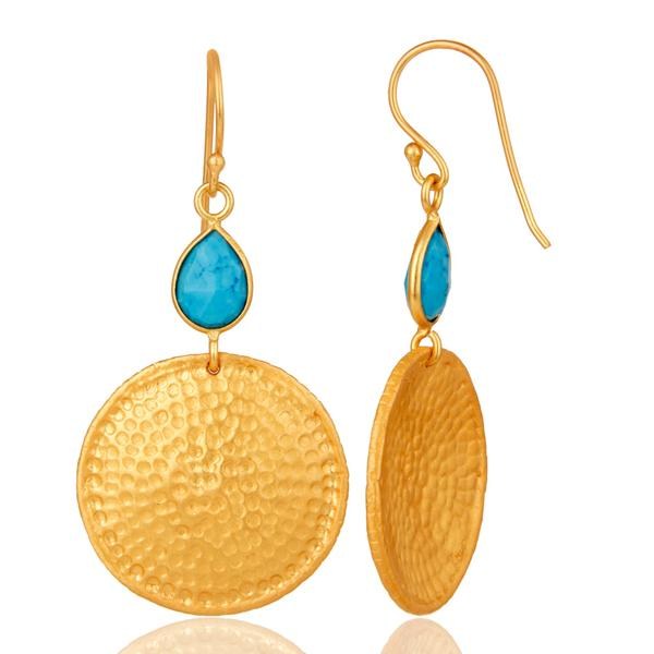 22K Gold Plated Sterling Silver Turquoise Disc Dangle Hammered Earrings