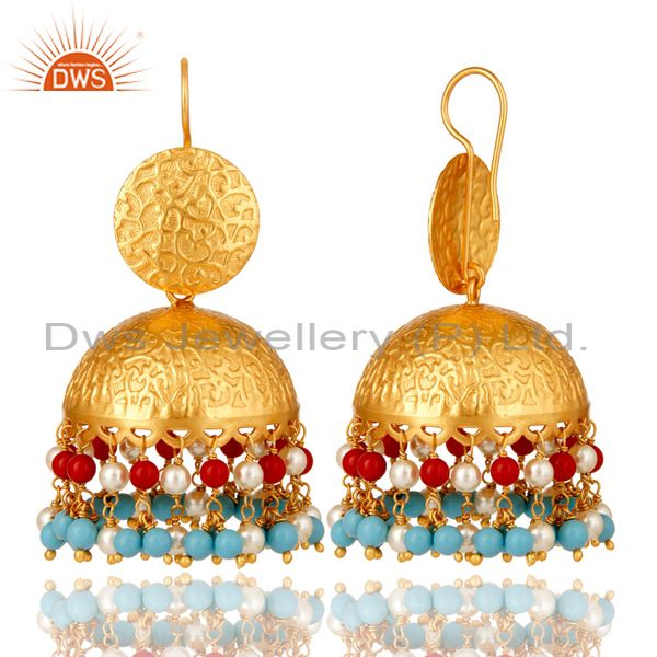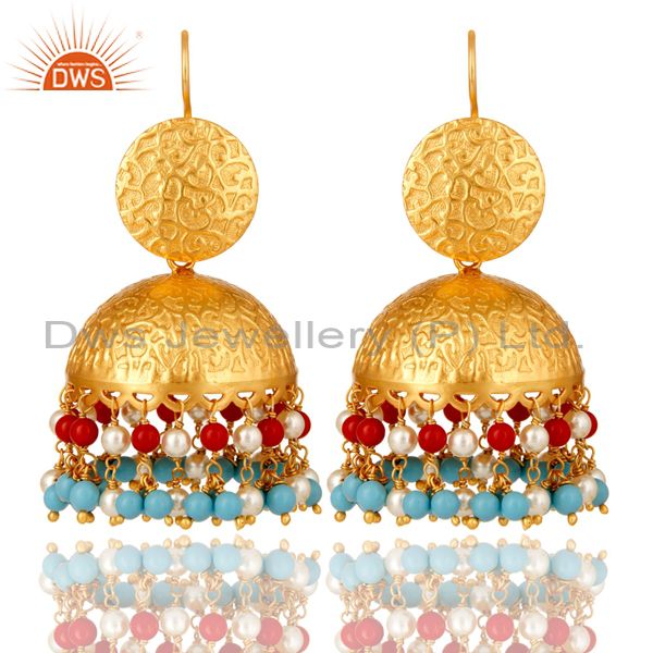 22K Matte Yellow Gold Plated Turquoise, Pearl And Red Coral Dangle Earrings