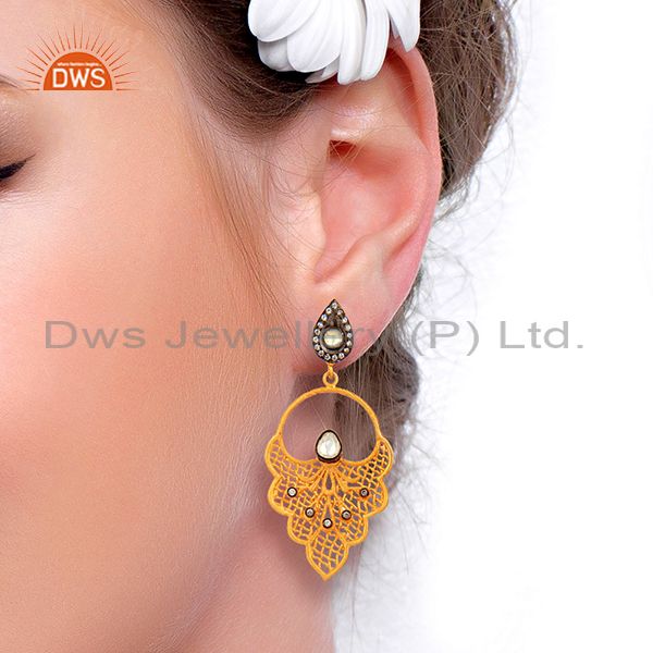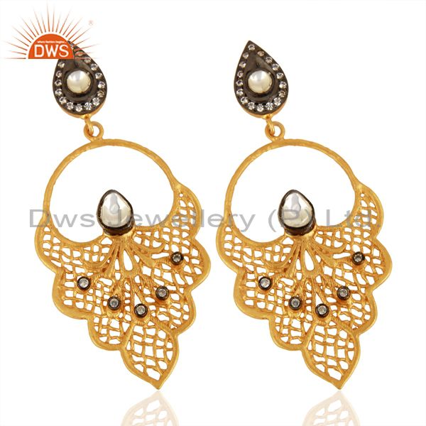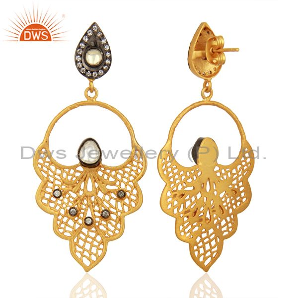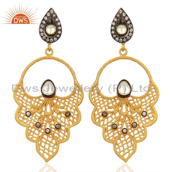 22K Yellow Gold Plated Brass Crystal Cz Polki Designer Dangle Earrings