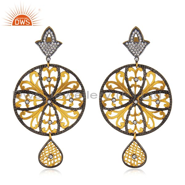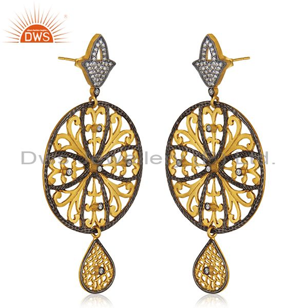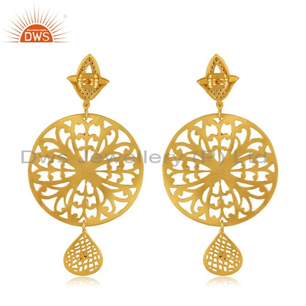 22K Yellow Gold Plated Brass Cubic Zirconia Flower Designer Dangle Earrings