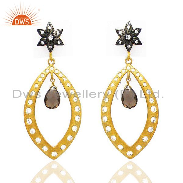 22K Yellow Gold Plated Brass Cz And Smoky Quartz Designer Dangle Earrings