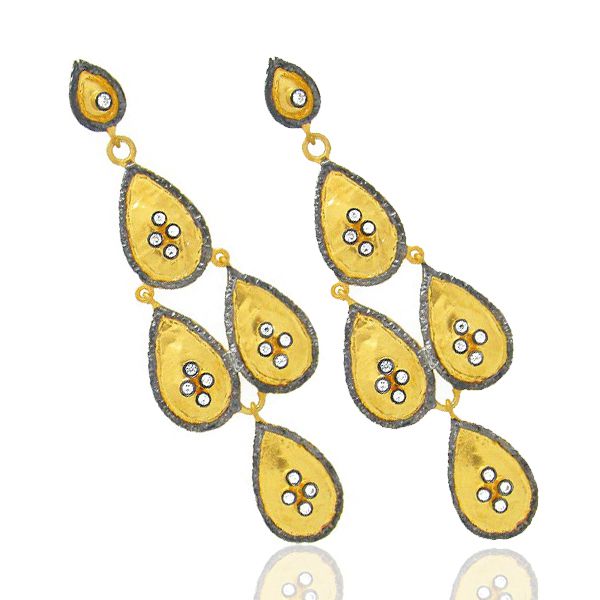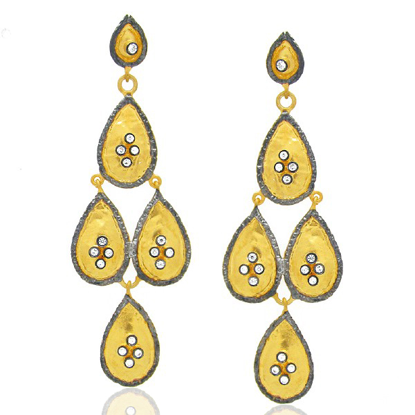 22K Yellow Gold Plated Brass Cz Hammered Teardrop Chandelier Earrings