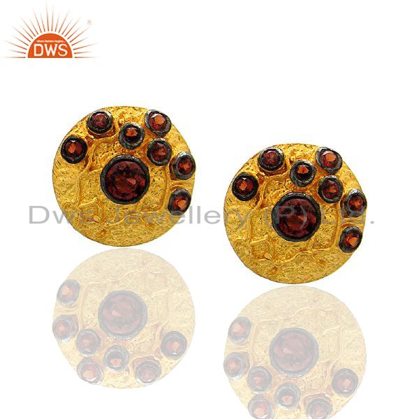 22K Yellow Gold Plated Brass Garnet Gemstone Disc Design Stud Earrings