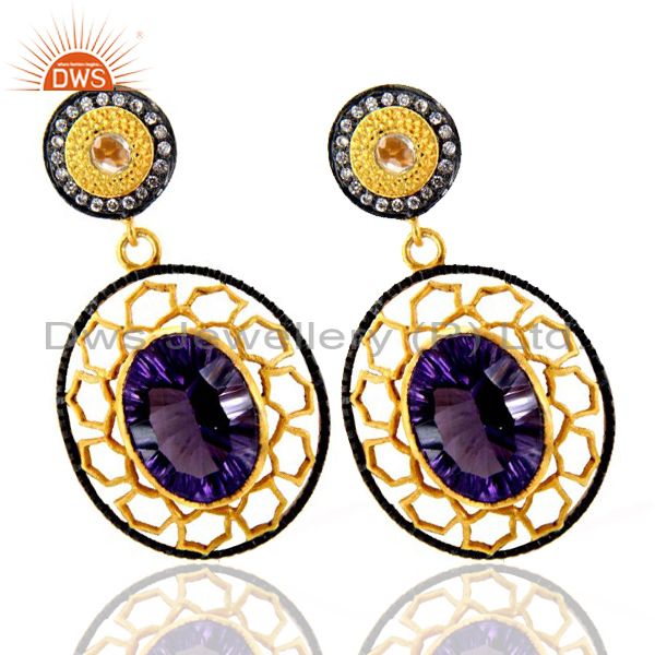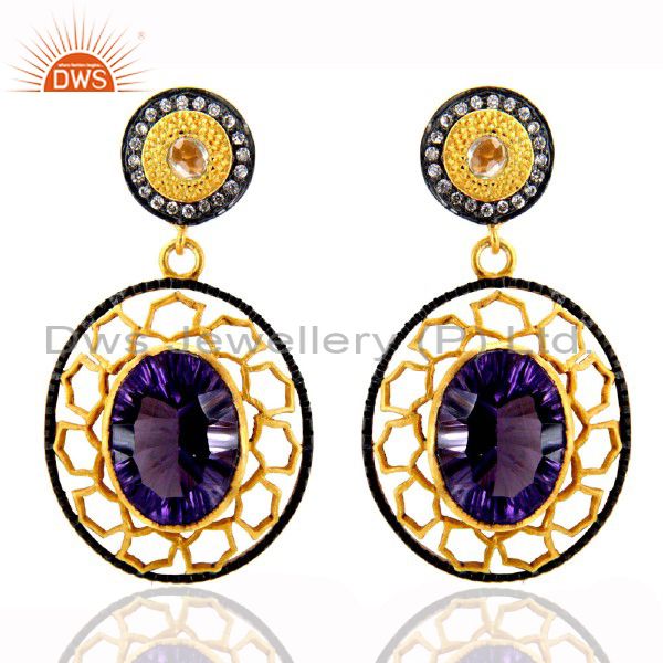 22K Yellow Gold Plated Brass Hydro Amethyst And Cz Designer Dangle Earrings