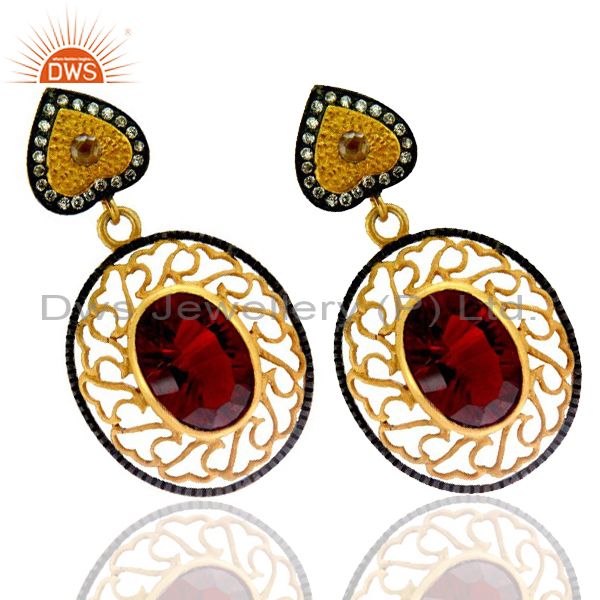 22K Yellow Gold Plated Brass Red Ruby Glass And Cz Designer Dangle Earrings