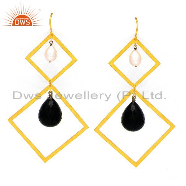 22K Yellow Gold Plated Sterling Silver Black Onyx And Pearl Dangle Earrings