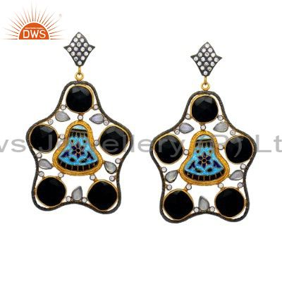 22K Yellow Gold Plated Sterling Silver Black Onyx Dangle Earrings With Cz