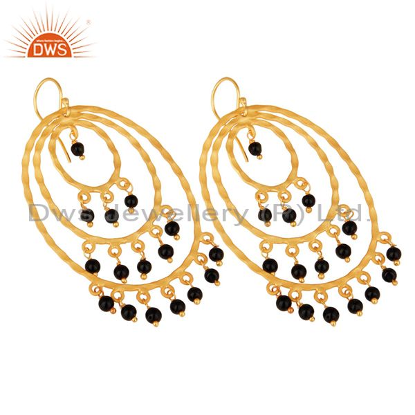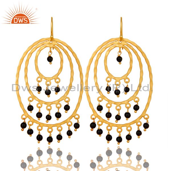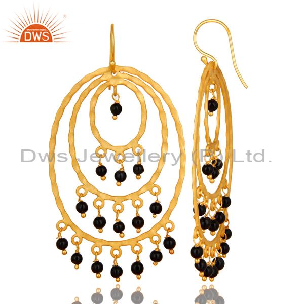 22K Yellow Gold Plated Sterling Silver Black Onyx Hammered Chandelier Earrings