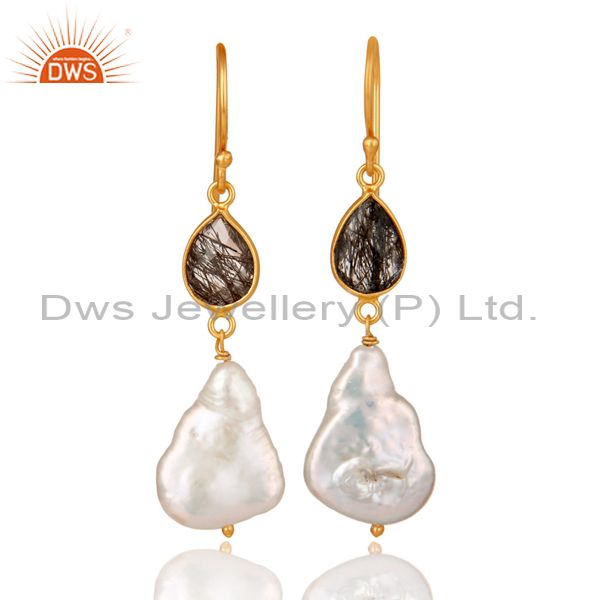 22K Yellow Gold Plated Sterling Silver Black Rutile And Pearl Drop Earrings