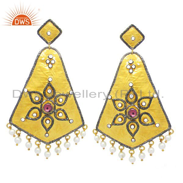 22K Yellow Gold Plated Sterling Silver Cz And Pearl Designer Chandelier Earrings