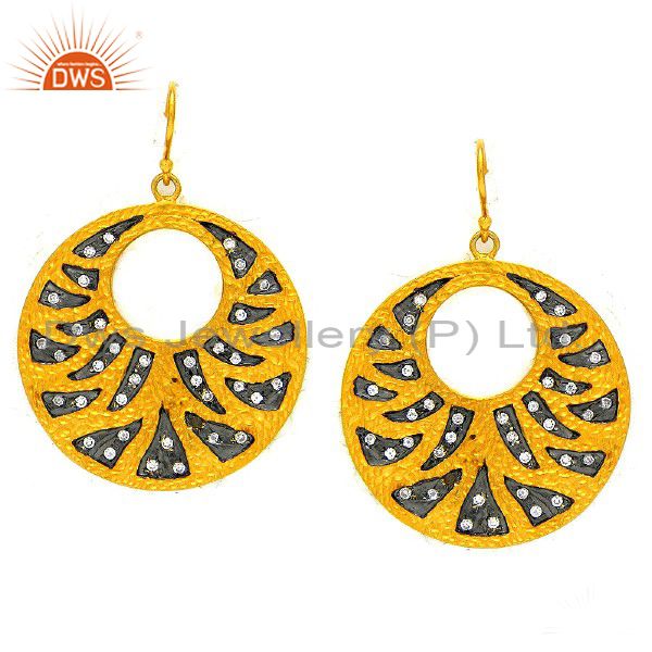 22K Yellow Gold Plated Sterling Silver Cz Hammered Disc Dangle Earrings