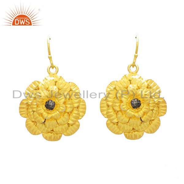22K Yellow Gold Plated Sterling Silver Flower Designer Dangle Earrings