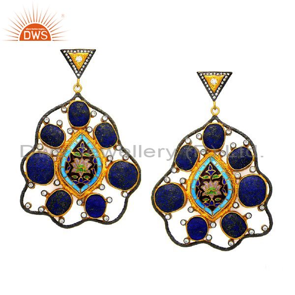 22K Yellow Gold Plated Sterling Silver Lapis Lazuli Dangle Earrings With Cz