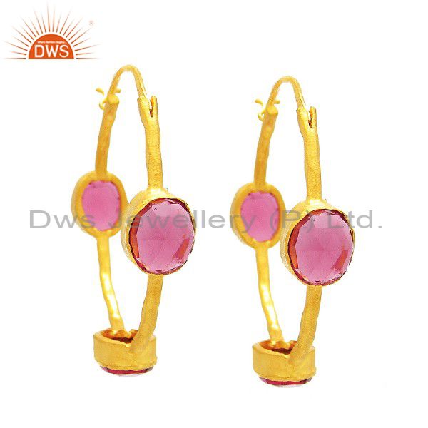 22K Yellow Gold Plated Sterling Silver Pink Glass Hoop Earrings