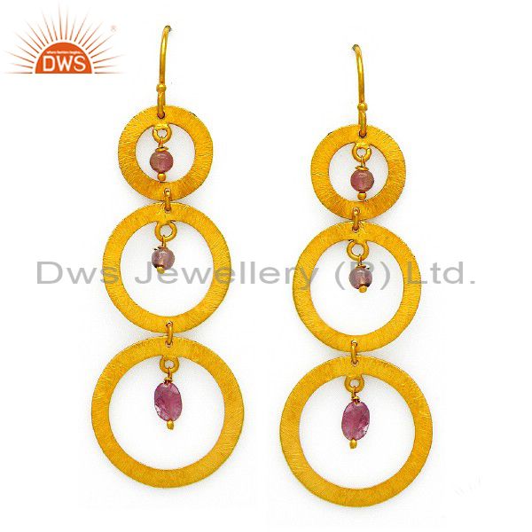 22K Yellow Gold Plated Sterling Silver Pink Tourmaline Circle Dangle Earrings