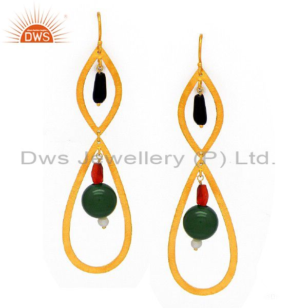 22K Yellow Gold Plated Sterling Silver Red Coral And Pearl Teardrop Earrings